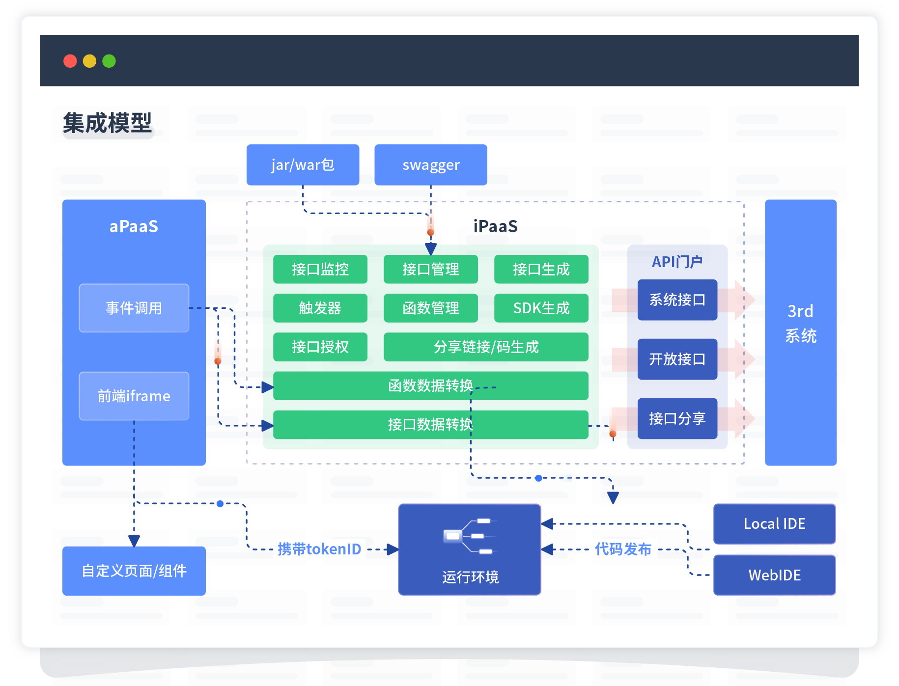 集成模型包括平台本身前、、、、后端能力的扩展,,,也支持通过API门户和第三方系统进行交互。。。。