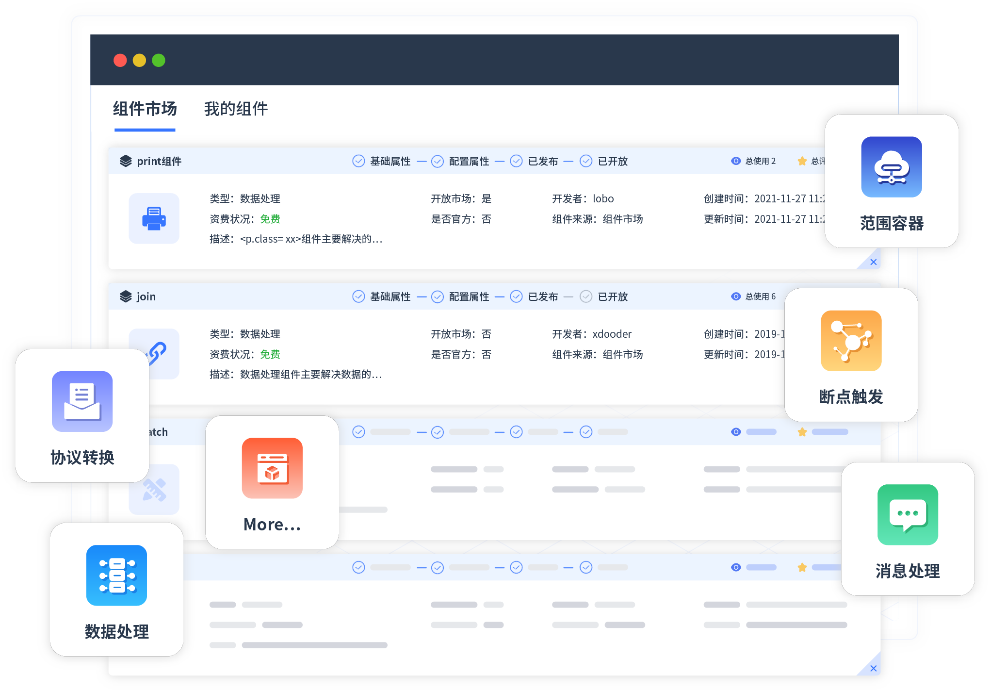 针对集成场景,,GOPAY钱包提供组件市场,,例如协议转换、、、、消息处理、、、、文件操作等。。除平台提供的组件外,,,,客户可以自定义所需组件。。。。