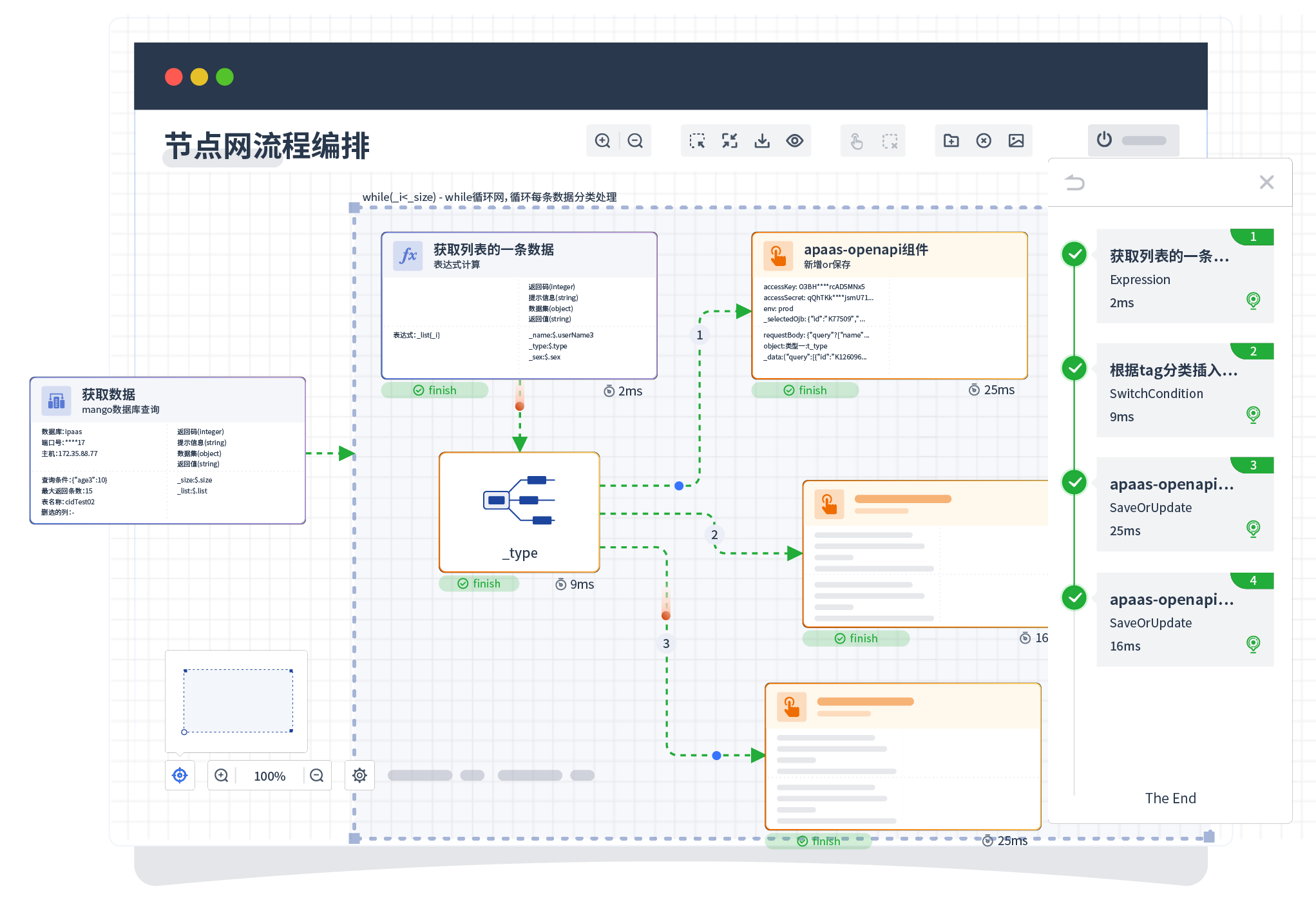 针对集成场景,,,,组件定义后支持进行流程编制,,,不同于传统代码方式,,,通过图形化展示,,支持在线调试、、日志查看和运行回放。。。。