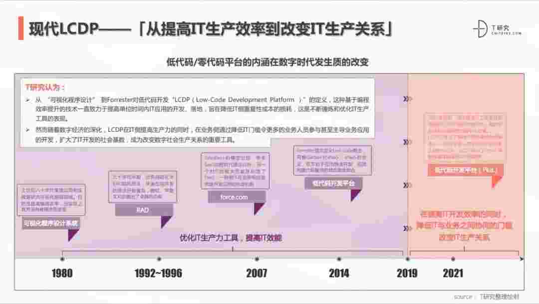 2020年前后,,,源于提高IT工作者开发效能的LCDP不断进化和衍生,,面对业务导向日益明显的数字化变革。。。LCDP衍生出了面向不同对象的升级服务——面向专业人群的LCDP和业务人群的NCDP,,,LCDP与NCDP的不同服务属性被逐渐认可和接受。。。。 LCDP在提高IT开发效率的同时,,降低IT与业务之间协同的门槛改变IT生产关系。。。